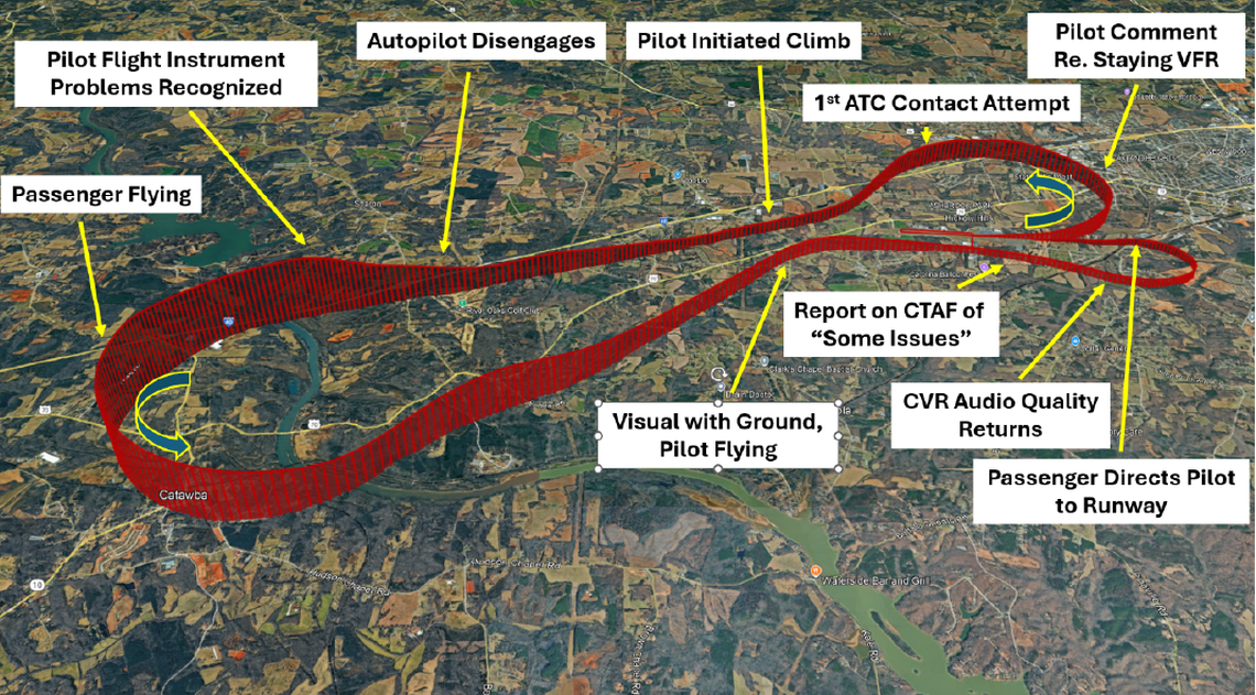 Uçağın parçalarının çalışmayı durdurduğu ve pilotun sola doğru keskin bir dönüş yaparak sadece 10 dakika önce ayrıldığı Statesville havaalanına geri inmeye çalıştığı, kazadan önceki korkunç anları canlandırıyor.
