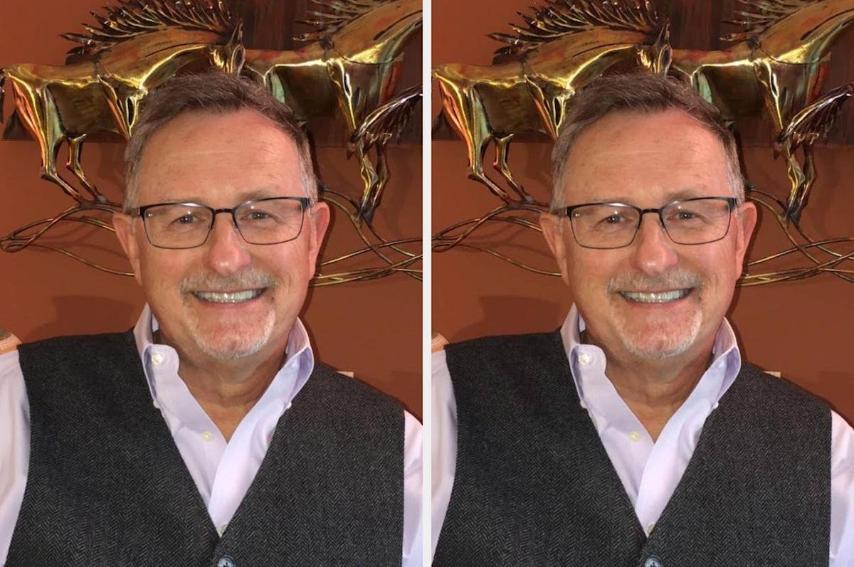 A man with glasses and a salt-and-pepper beard wears a white shirt and gray vest, smiling in front of a horse-themed wall decoration